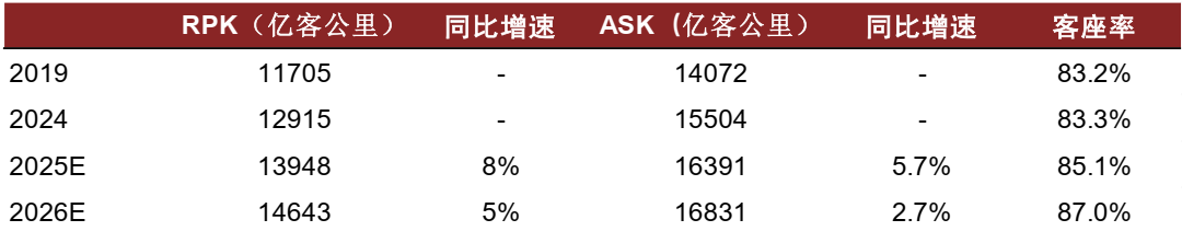 我们预计2025年ASK同比增速约为5.7%,而2026年ASK同比增速将明显下滑至约2.7%,主要是因为2026年飞机利用率提升空间较小,而机队增速也未有明显提升。