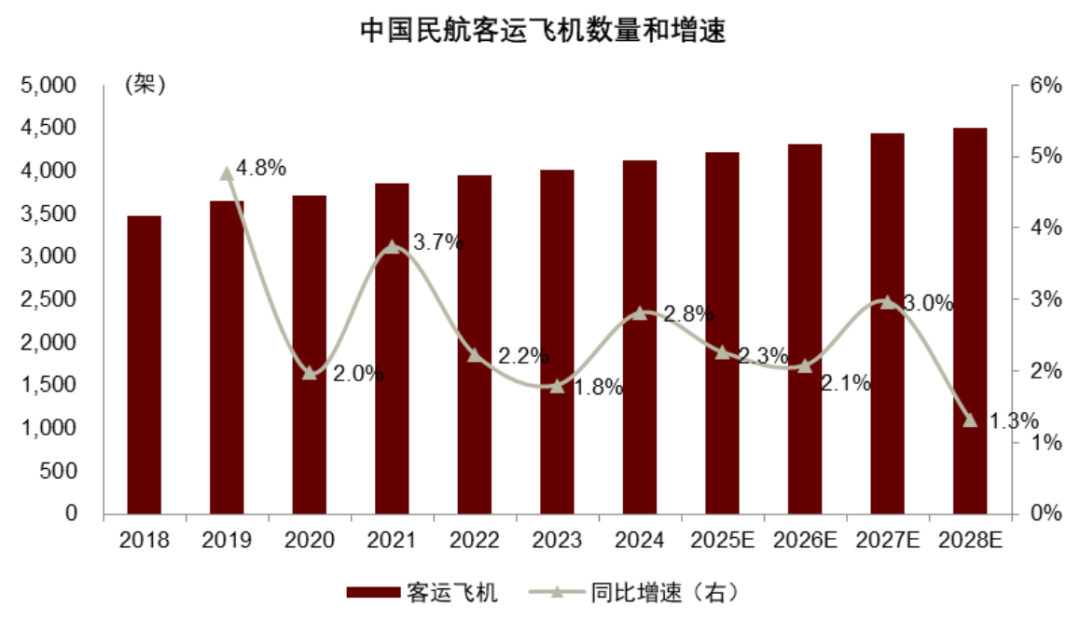 图表8:我们预计2026年全行业客运机队同比增速约2.1%,2025-2028年平均约为2.2%
