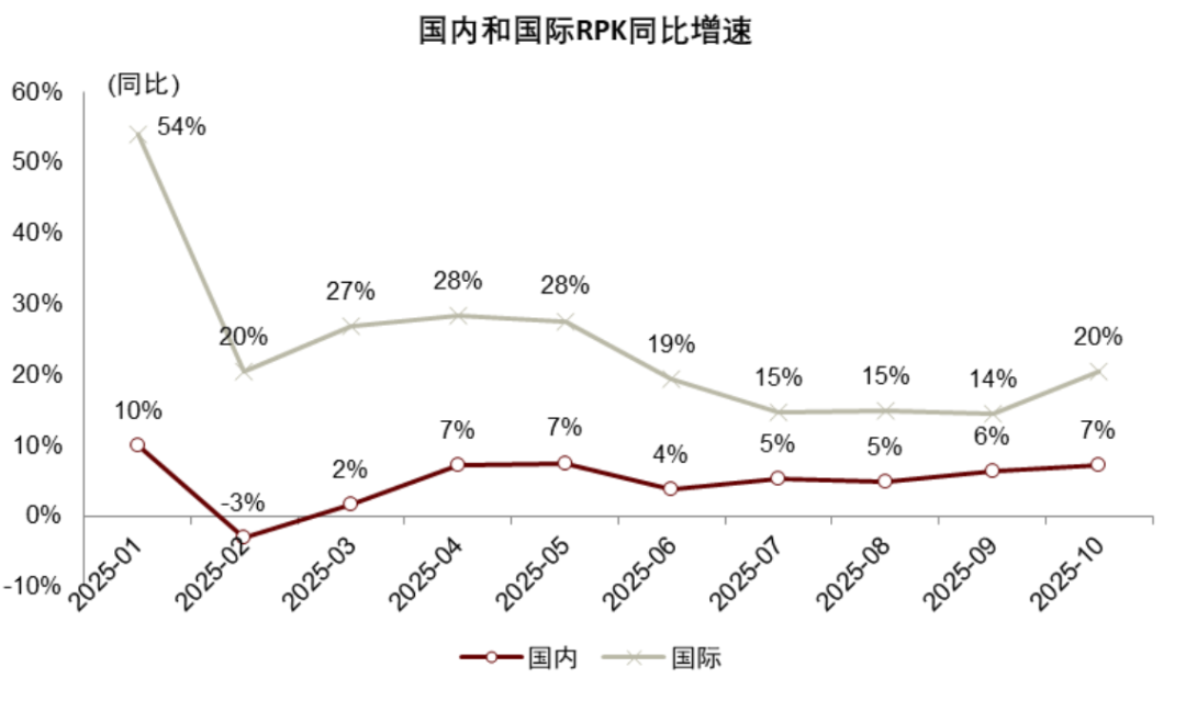 图表9:2025年前10个月国内、国际旅客周转量保持较快增长