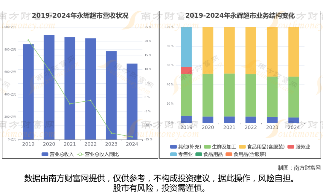永辉超市年报数据显示(如上图),2024年实现营业总收入675.74亿,同比增长-14.07%,近5年复合年增长率-7.72%。