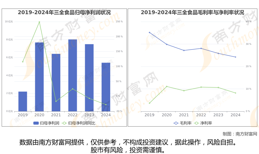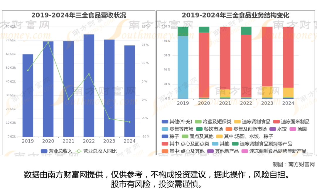 三全食品2024年数据显示(如上图),公司2024年营业收入66.32亿,同比增长-6%,近五年复合年增长率-1.08%。