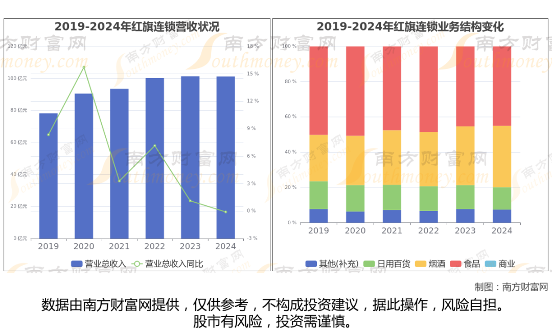 红旗连锁年报数据显示(如上图),2024年实现营业总收入101.23亿,同比增长-0.09%,近5年复合年增长率2.83%。