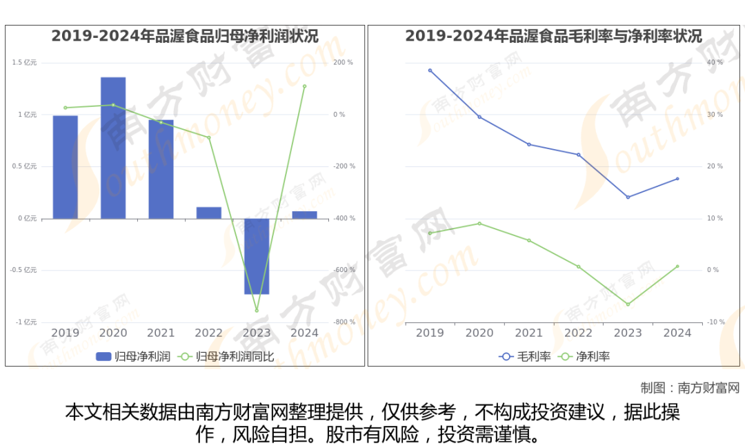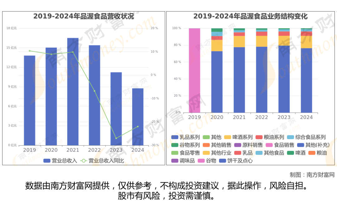 数据显示(如上图),品渥食品公司2024年营业收入8.76亿,同比增长-21.98%,近5年复合年增长率(CAGR)-12.61%。