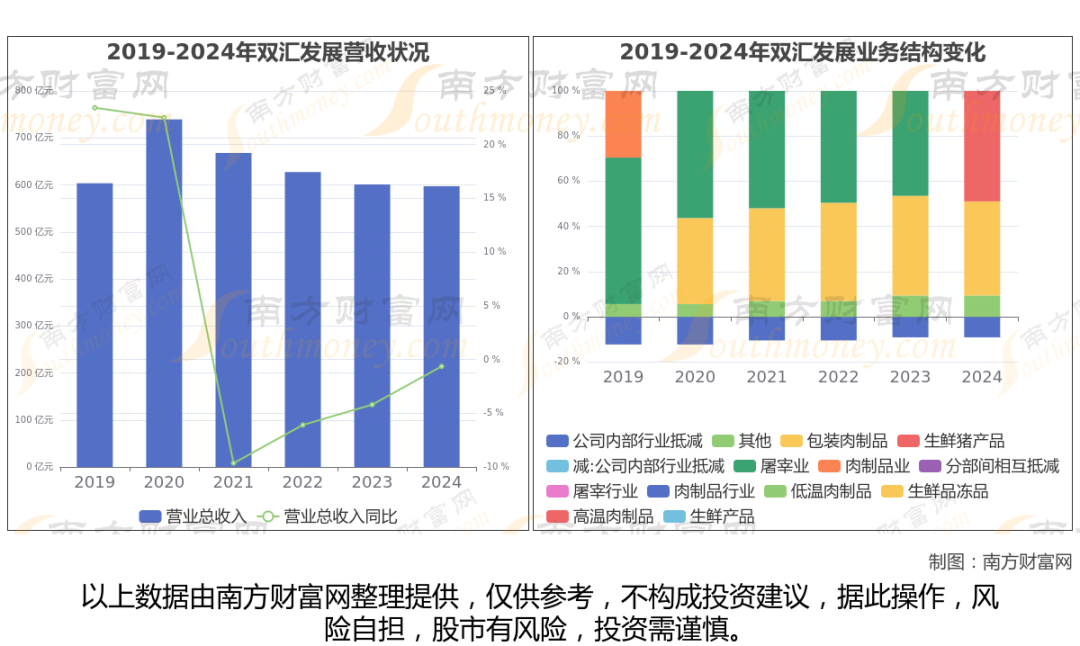 双汇发展于1998年12月10日在深圳证券交易所上市,公司主营业务为以屠宰业和肉类加工业为核心,向上游发展饲料业和养殖业,向下游发展包装业、商业,配套发展外贸业、调味品业等。