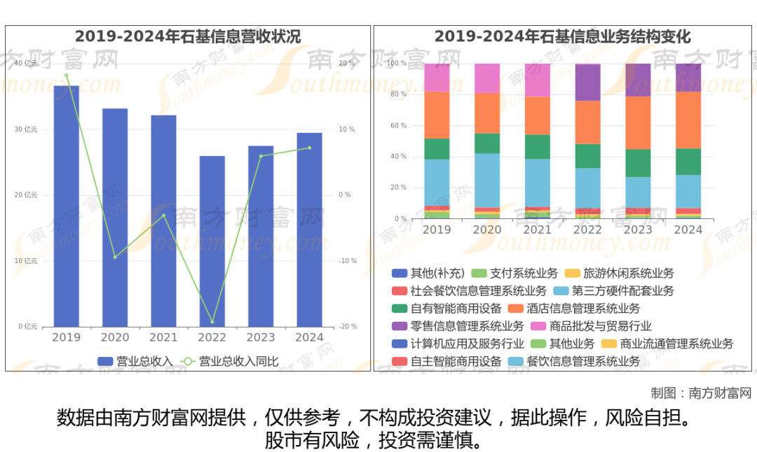 (如上图)石基信息2024年全年营业收入为29.47亿,同比增长7.2%,近五年复合年增长率-2.91%。