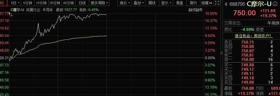 从A股市值角度看,C摩尔-U已超过北方华创,在芯片概念股中排名第三,仅次于寒武纪-U、海光信息。从股价来看,C摩尔-U股价也排名第三,仅次于寒武纪-U和贵州茅台。