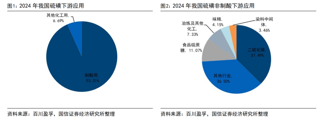 硫磺最主要应用为制备硫酸,二硫化碳、蔗糖制备、冶金等领域同样需要硫磺。据百川盈孚数据,2024年国内93%的硫磺被用来制备硫酸,进而应用于磷肥、钛白粉、己内酰胺等产品制备。约7%左右的硫磺被用于二硫化碳制备、蔗糖脱色、冶金、染料中间体制备等领域。