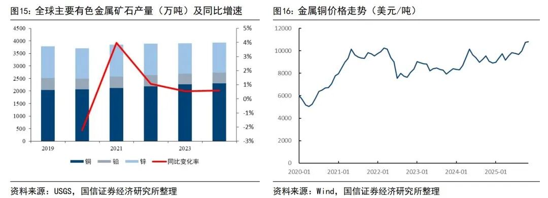 主要有色金属需求疲软,冶炼副产硫酸增速维持低位。铜、铅及锌是三种最重要的硫化矿物,据USGS数据,2024年全球铜矿石生产量为2300万吨,铅矿石生产量为430万吨,锌矿石生产量为1200万吨,合计产量为3930吨,同比增长0.59%。其中只有铜矿石产量出现了正增长。展望未来,铜下游需求旺盛,但受限于矿山的开发,在近期有望保持2%左右的需求增速。铅、锌由于下游需求较为稳定,矿山开发增量较少,铅、锌精矿产量预计仍保持平稳。