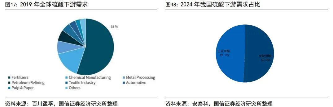 硫酸最重要的应用是制备化肥,在钛白粉、己内酰胺、磷酸铁的制备过程中同样有重要应用。2019年全球55%的硫酸被用来制备化肥。2024年我国约51%的硫酸被用于化肥工业,其余则被用于制备钛白粉、己内酰胺、氢氟酸、磷酸铁等产品。