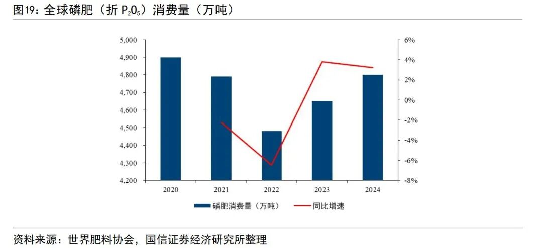 磷肥需求增长较为温和,非洲及中东磷肥产能仍有扩张。2020年,由于农作物产品价格较好,化肥需求国中印度及美国天气状况良好,叠加部分需求前值,导致该年磷肥消费量出现了大幅增长。2021年由于高基数、2022年由于化肥价格较高、极端天气及种植面积减少,磷肥消费出现了萎缩。2023-2024年磷肥需求出现了反弹,但由于磷肥价格较高,消费增长较为温和。根据世界肥料协会预测,2025-2029年P2O5的年复合增长率为1-2%。2022年,摩洛哥OCP集团计划投资130亿美元,将摩洛哥磷肥产能从1200万吨提高到2000万吨。2025年,沙特阿拉伯矿业公司决定投资期第三个磷肥制造项目,以增加300万吨/年的磷肥生产能力。