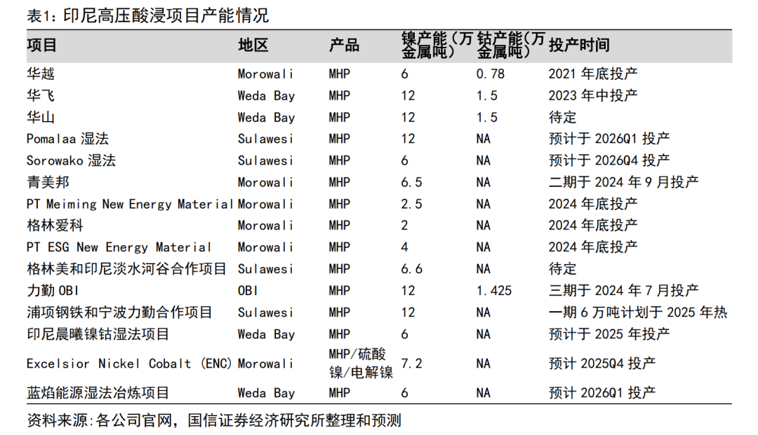 红土镍矿通过高压酸浸制备MHP竞争力强,印尼未来仍有大量产能投产。印尼是全球镍资源储量最丰富、镍矿产量最大的国家。高压酸浸工艺可以处理印尼低品位红土镍矿,且可以回收其中的有价元素钴,主要产出氢氧化镍钴(MHP),能耗低、碳排放量少,较其他工艺路线具有显著的成本优势。印尼MHP产能从2022年开始逐步进入到快速放量阶段,2025年底-2026年约有30万金属吨镍产能有待释放。每金属吨镍的生产预计耗酸30吨左右,预计印尼硫磺/硫酸需求量持续快速上升。