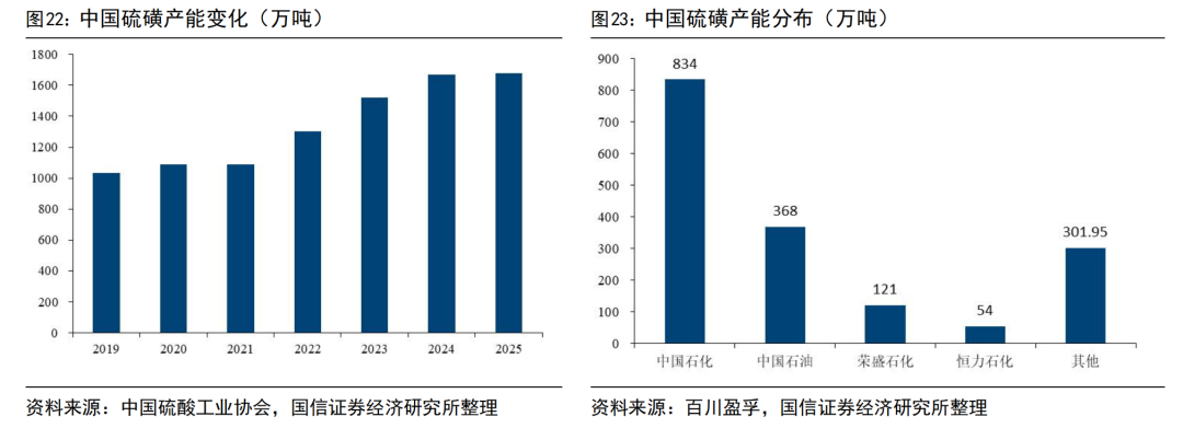 国内硫磺产能增速放缓,炼化企业产能领先。中国超七成硫磺来源于石油炼化副产,天然气伴生的硫磺占比约2成,煤化工也副产部分硫磺。根据百川盈孚数据统计,目前我国硫磺产能为1678.95万吨。由于我国原油加工能力需控制在10亿吨,未来炼化产能增量较少,硫磺产能上行空间较小。从硫磺产能集中度看,中国石化炼化产能庞大,叠加普光气田为高硫气田,伴生硫磺产量较大,为国内硫磺产能龙头,2025年合计硫磺产能达834万吨,其次中国石油具备硫磺产能368万吨,荣盛石化具备硫磺产能为121万吨。
