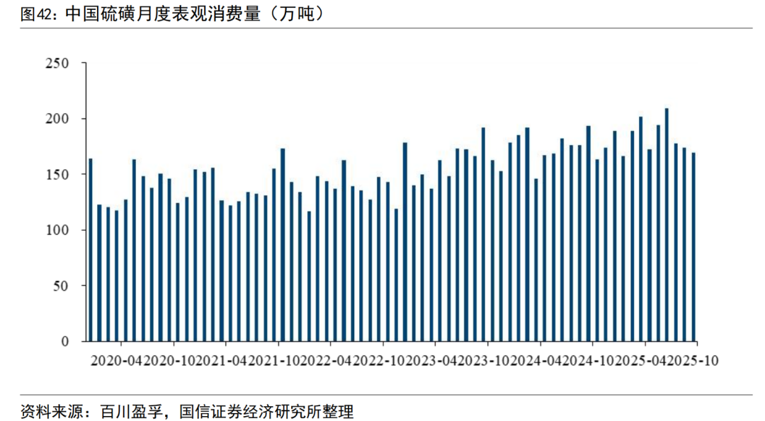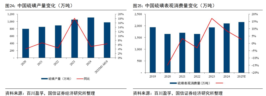 中国硫磺产量及表观消费量均呈现趋势上升。我国硫磺随炼化能力提升逐步提高,2024年我国硫磺产量为1106.7万吨,同比上升5.18%,2025年前10个月,我国硫磺产量为974.6万吨,同比上升6.45%。表观消费量方面,2024年我国硫磺表观消费量为2101.6万吨,同比上升8.61%。据百川盈孚预测,2025年我国硫磺表观消费量可达2161.2万吨,同比微增2.83%。