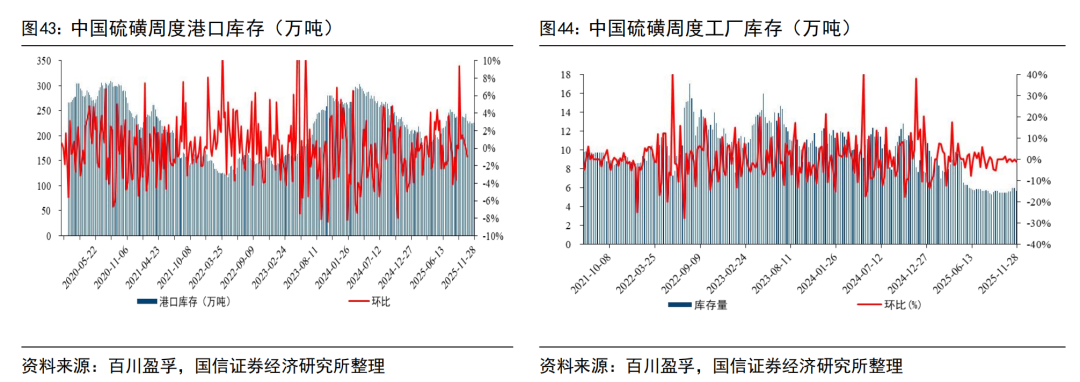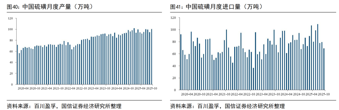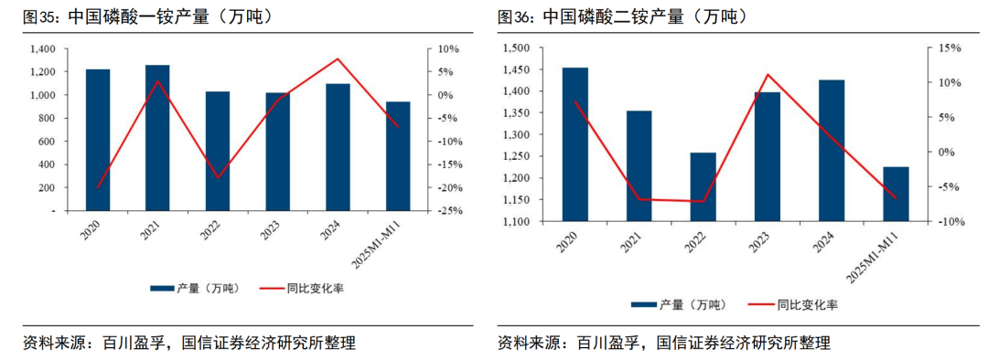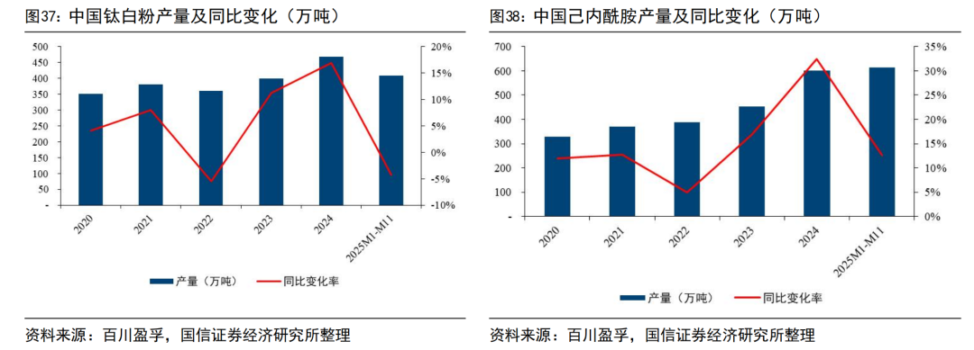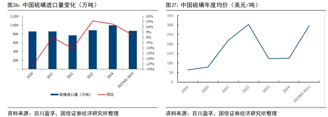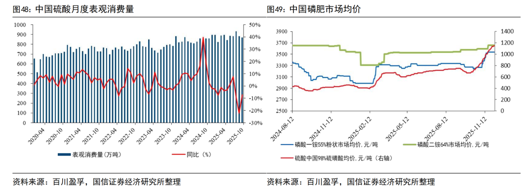 我国磷肥产量较为稳定,耗酸化工品产量部分增加。2024年磷酸一铵和磷酸二铵产量分别为1098万吨和1425万吨,2025年前11个月,我国磷肥产量同比均有一定下滑。2024年我国钛白粉产量为467万吨,2025年前11个月我国钛白粉产量同比小幅下降4.2%,2024年我国内酰胺产量为601万吨,2025年前11个月己内酰胺产量同比高增12.6%。