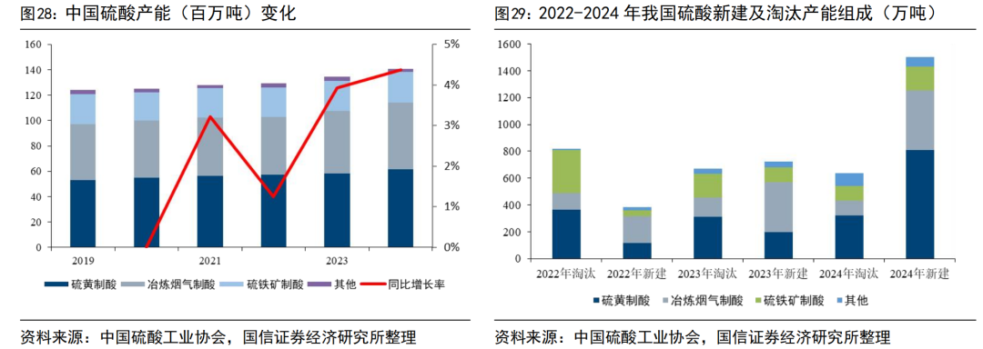 国内硫酸产能持续增长。据中国硫酸工业协会2024年,我国硫酸总产能达到为1.406亿吨,同比上升4.4%。其中硫磺制酸产能为6139万吨,冶炼烟气制酸(产能为5273万吨,硫铁矿制酸产能为2437万吨,其他制酸产能为212万吨。预计2025-2027年,我国新建硫酸产能和新建下游产品产能仍然较大,行业新老交替继续进行。据中国硫酸工业协会数据,2024年我国硫酸停产产能为637万吨,其中硫磺制酸产能为322万吨;2024年新建硫酸产能总计1500.5万吨。预计2025-2027年,我国新建、拟建硫酸产能总计超过2589.7万吨,其中硫磺制酸产能1115万吨,冶炼酸产能1308.3万吨。冶炼烟气制酸产能占比预计持续提升。