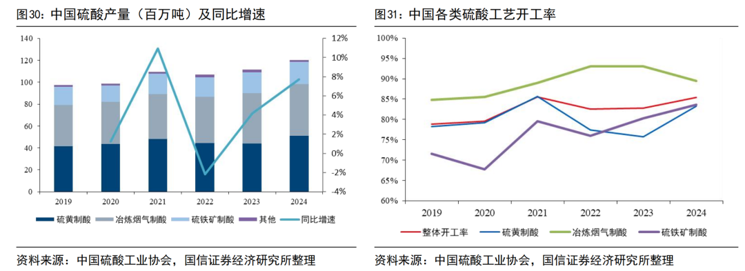 国内硫磺制酸带动硫酸产量高增。据硫酸行业协会数据,2024年我国硫酸产量为1.201亿吨,同比增长7.7%。其中,硫磺制酸产量5106.6万吨,同比增长15.6%;冶炼酸产量4718.9万吨,同比增长2.8%,硫铁矿制酸产量2037.7万吨,同比增 长7.1%。硫磺制酸量增速迅猛,成为补足下游需求重要手段。2024年我国硫酸行业平均开工率为85.4%,同比上升2.6 个百分点。其中硫磺制酸开工率83.2%,同比上升7.4 个百分点;冶炼酸开工率89.5%,同比下降3.6 个百分点;硫铁矿制酸开工率83.6%,同比上升3.3 个百分点;其他制酸开工率67.8%。硫磺制酸多为下游企业主动配套建设,从开工率大幅提升也表明了硫酸下游需求的旺盛。