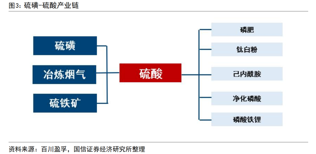 硫磺最重要的下游应用为制备硫酸,硫酸有“工业之母”之称。硫酸下游应用中,化肥用酸约占一半,此外硫酸在化工、冶金、医药等领域同样有着重要应用。硫酸的主要有硫磺制酸、冶炼烟气制酸和硫铁矿制酸三种工艺。