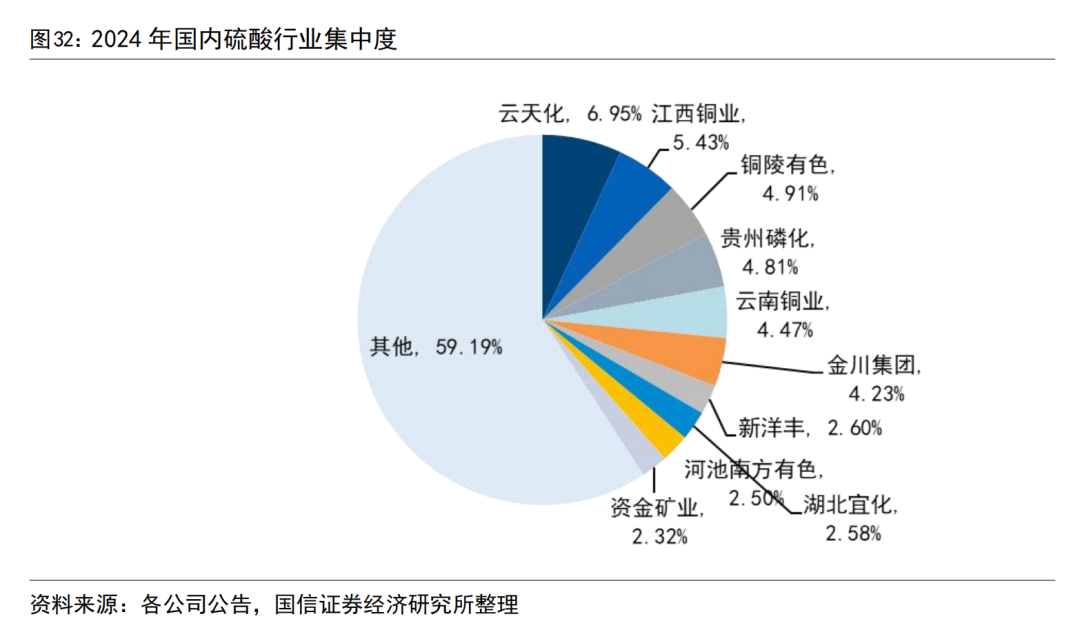 硫酸产能仍在不断集中。据硫酸行业协会数据,2024年我国硫酸产量前10名企业产酸量合计为4901万吨,占行业总产量的40.8%。前10大企业不论从绝对产量还是相对份额都有提升,这显示了制酸行业集中度仍在不断提高。