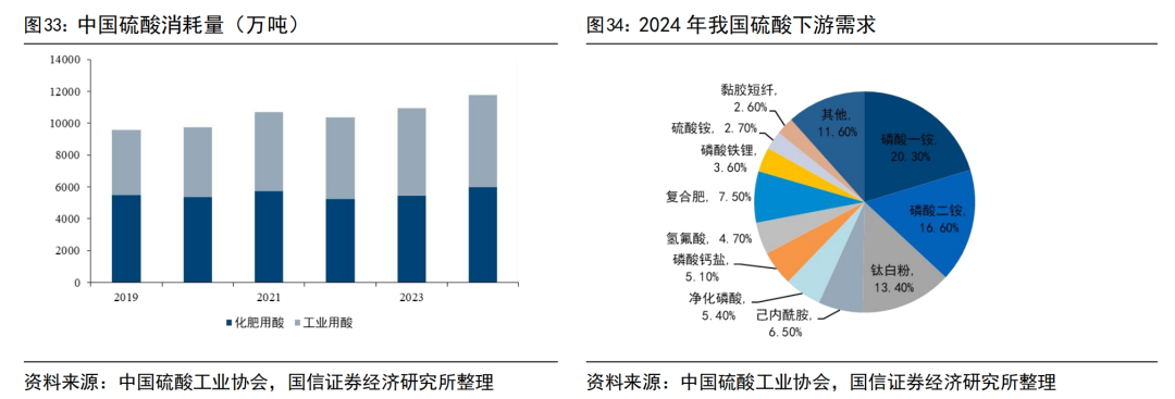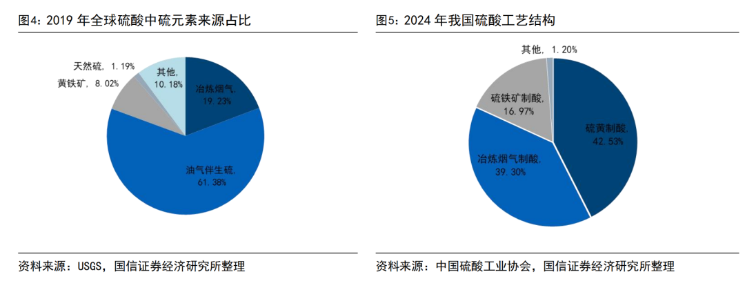 我国硫磺制酸占比高,也是下游磷肥企业首选的制酸配套工艺。2024年我国硫酸产能1.41亿吨,产量为1.20亿吨,平均开工率为85.4%。2024年硫磺制酸5106.6万吨,占比42.5%,为国内最重要制酸工艺。磷肥作为硫酸最大的下游,2024年国内磷肥的硫酸需求占比50.9%。硫磺制酸几乎是所有头部磷肥企业首选的制酸工艺。硫磺制酸对保证硫酸供应意义重大。