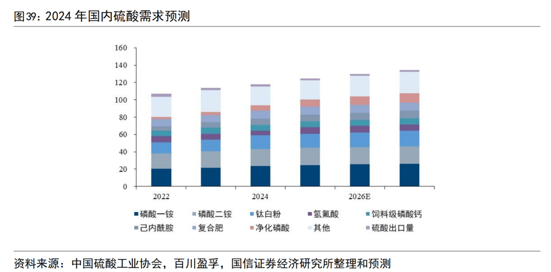 我们预计2025年国内硫酸需求增速在5%左右,未来两年增速约为4%。我国硫酸需求基本盘较为稳定,农用磷肥需求增速预计为1%-2%。钛白粉、氢氟酸等传统化工产品预计保持低速增长。新能领域对磷酸一铵及净化磷酸需求增量较大。根据以上假设我们测算得到2025年我国硫酸消费预计为1.25亿吨,同比增长5.6%。2026-2027年硫酸需求分别为1.30和1.34亿吨,增速分别可达4.1%和3.5%。