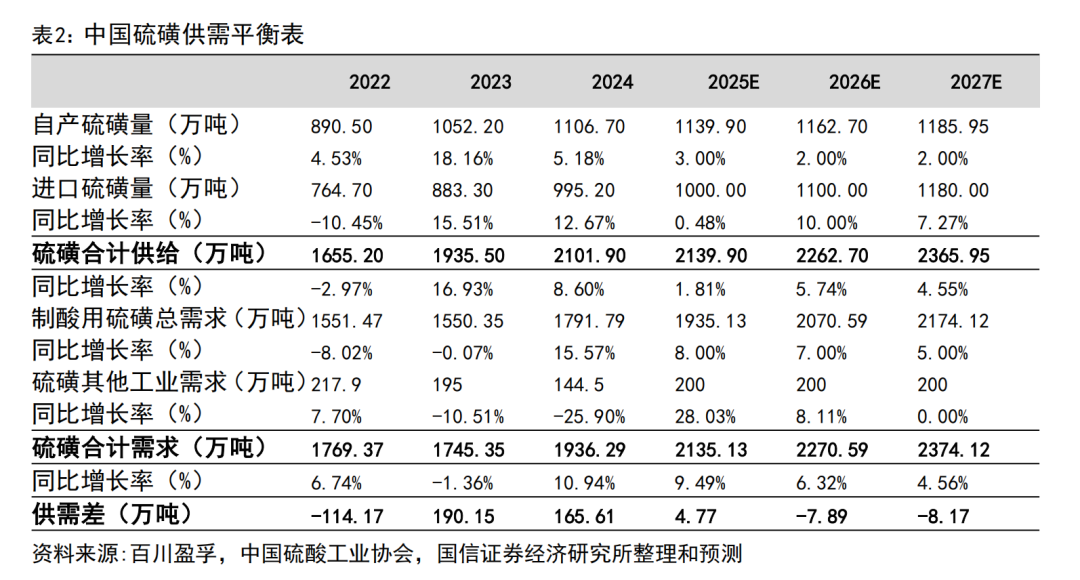 硫磺最重要应用为制备硫酸,硫酸需求预计仍将保持中速增长,这直接导致硫磺全球供应偏紧。2024年中国93%的硫磺被用来制备硫酸。全球约一半的硫酸用来制备化肥,钛白粉、己内酰胺、磷酸铁等也为重要的耗酸化工品。世界肥料协会预测,2025-2027年全球磷肥需求复合增速为1-2%。由于动力电池及储能需求旺盛,带动相关产品产量高增。2024年,磷酸铁产量为189万吨,增速为31%。印尼红土镍矿丰富,高压酸浸路线优势明显,2025年底-2026年底,仍有约30万金属吨镍产能待释放。高压酸浸路线下,制备每金属吨镍需耗酸约30吨。在新能源需求快速释放下,硫酸需求保持中速增长,同时带动硫磺需求增长,导致全球硫磺供需偏紧。