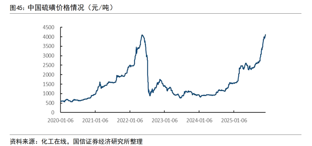 目前我国硫酸-硫磺产业链景气度较高,硫磺价格有望上行。我国2025年1-10月硫磺产量为972万吨,同比上升6.5%,硫磺进口量870万吨,同比上升2.2%,表观消费量为1841万吨,同比上升4.4%。12月4日,国内固态硫磺现货价为4100元/吨,同比上涨165.37%。近期磷肥出现涨价,硫磺高价开始向下游传导。硫磺为在全球供需基础上国际定价商品,在全球供需偏紧、海外合同价格不断走高情况下,国内硫磺价格有望进一步上涨。