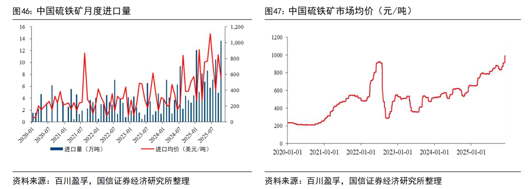 硫铁矿进口量及市场均价明显上涨。2024年我国硫铁矿进口量仅为53.82万吨,较2023年的31.12万吨同比上升了72.94%。2025年前十个月我国硫铁矿进口量为82.40万吨,同比上升了78.51%。2025年12月4日硫铁矿市场均价为991元/吨,环比上周 8,18%,环比上月 14.30%,同比去年 126.60%。