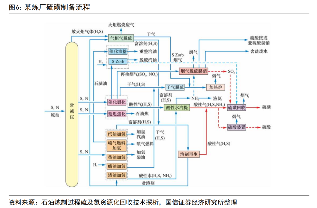 硫磺最主要来源为油气资源伴生,产量弹性小。天然气及原油开发过程中常会伴生H2S、CO2等酸性组分和一些有机硫化物。如普光气田天然气中H2S含量达13%-18%,原油中硫的质量分数在0.05%-14%之间,国内加工的原油大部分硫含量低于4%。由于还原态硫对设备和管道的安全运行具有严重的危害,且硫的存在会使催化剂丧失活性。所以油气加工过程中必须对还原态硫进行处理,因此油气开采冶炼会伴生大量的硫磺。硫磺回收最常采用Claus工艺,脱硫单元采出的全部酸性气进入反应炉,且1/3的H2S燃烧生成SO2,随后再与另外2/3的H2S在反应炉内发生Claus反应,生成单质硫。