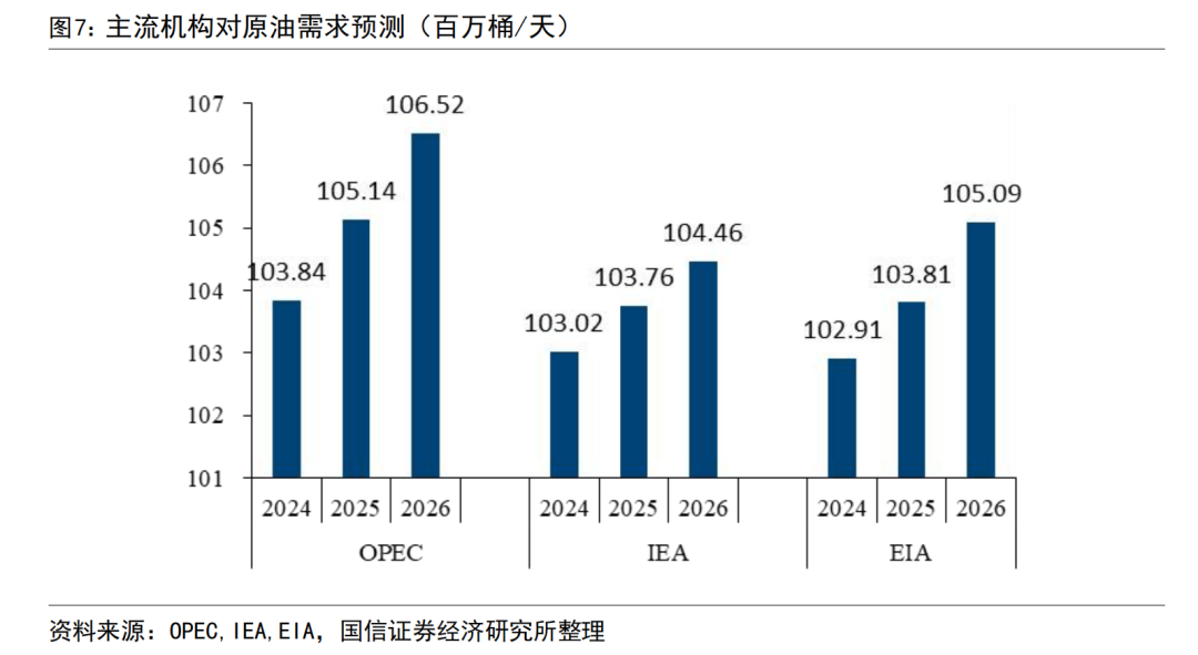 主流机构均预测未来原油需求增长速度较低。随着世界局势的变化及人们对低碳可持续发展观念认同的加深,人们对于能源安全与清洁的要求越来越高,风、光等可再生能源在人类能源需求占比越来越高。可再生能源的大力发展的同时,化石能源消费增速却逐步放缓。根据OPEC、IEA、EIA最新9月月报显示,2025年原油需求分别为105.14、103.76、103.81百万桶/天,分别较2024年增加1.3、0.74、0.9百万桶/天,原油需求年增速仅为1%左右。
