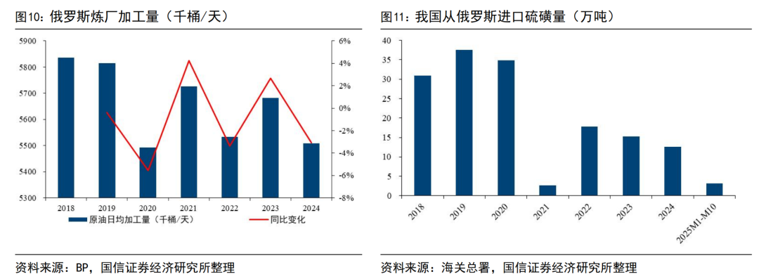 俄乌冲突导致的俄罗斯炼油能力下降,破坏了脆弱的硫磺贸易平衡。2025年夏季以来乌克兰军方频繁袭击俄罗斯炼油厂等基础设施。9月5日,设计规模为1710万吨/年的梁赞炼油厂遭受攻击。9月14日,乌克兰无人机袭击了产能规模为1700万吨/年的基希里炼油厂。9月18日,产能1000万吨/年的撒拉瓦特炼油厂遭到攻击。10月1日,年产能规模为1570万吨的雅罗斯拉夫炼油厂遭到袭击。据英国金融时报报道,乌克兰无人机袭击导致的俄罗斯炼油产能减少每天超过100万桶。俄罗斯联邦统计局显示2024年俄罗斯炼油产量为550万桶/天,减产幅度达到17%以上。俄罗斯是全球第二大硫磺生产国,其炼油能力的下降直接影响了副产硫磺的生产和出口。我国从俄罗斯进口的硫磺量同样呈现趋势下降的情况,全球原本脆弱的硫磺供需平衡被打破。