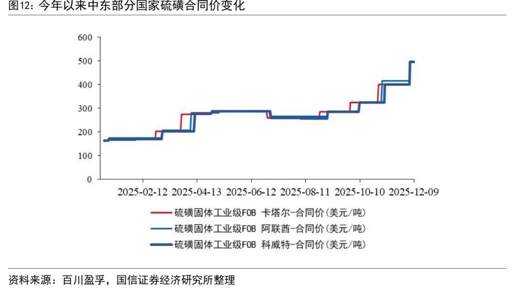 中东硫磺由于供应稳定,价格今年以来实现了大幅上涨。市场目前已经接受俄罗斯硫磺出口降低的现状,但随着冲突的持续进行,经俄罗斯出口的部分中亚国家生产硫磺供应有受阻风险。市场更加青睐供应稳定的中东硫磺,这进一步推高了中东硫磺价格。2025年初中东硫磺合同价为163-165美元/吨。近期中东多个国家分别上调了硫磺12月份官方合同价格至495美元/吨,折合人民币到岸价约4250元/吨左右。中东硫磺合同价环比上个月上涨80-95美元/吨,较年初上涨330-332美元/吨,实现了大幅上涨。