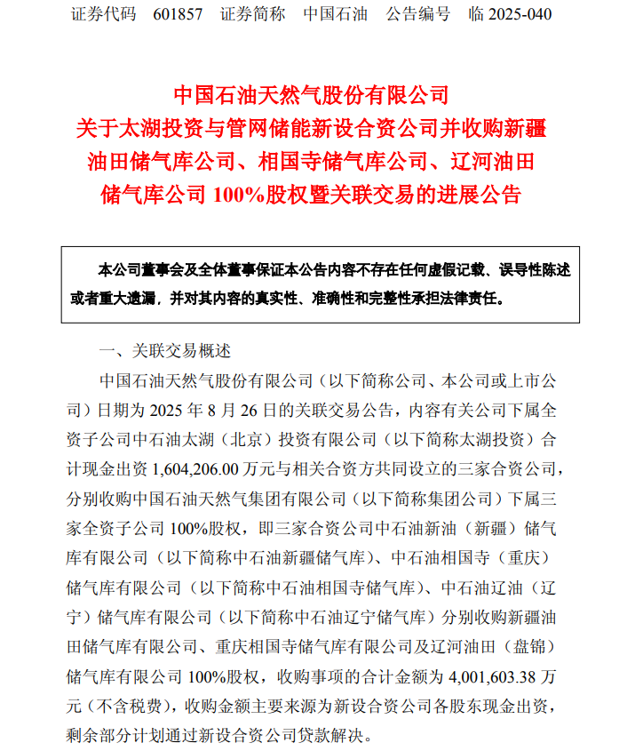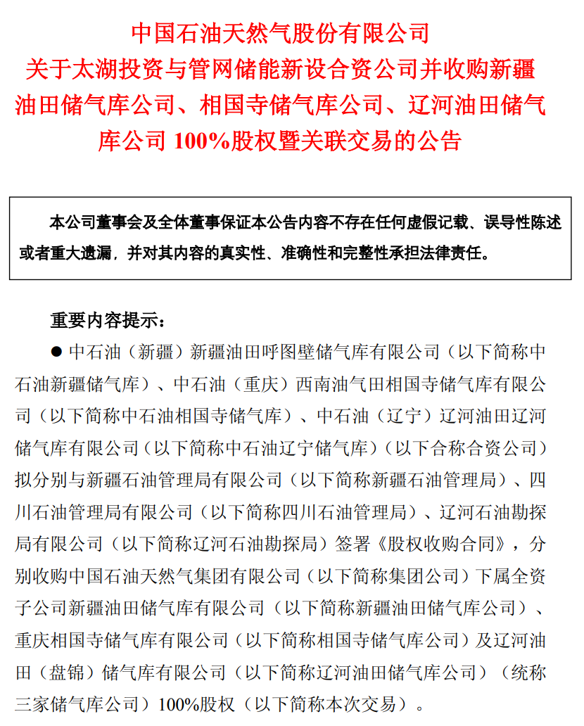 今年8月,中国石油正式发布400.16亿元的并购公告,下属全资子公司太湖公司拟与相关合资方分别以现金出资,新设三家由太湖公司控股的合资公司,分别出资99.95亿元、170.66亿元及129.55亿元,收购集团公司下属全资子公司新疆油田储气库公司、相国寺储气库公司及辽河油田储气库公司100%股权。