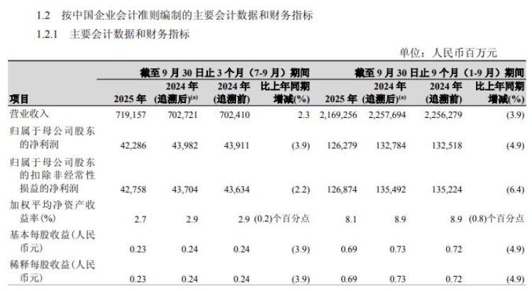 2025年前三季度,中国石油实现营收21692.56亿元,同比下降3.9%;归母净利润为1262.94亿元,同比减少4.9%。其中,第三季度实现营收7191.57亿元,同比增长2.3%;归母净利润为422.87亿元,同比下降3.9%,环比回升13.7%。尽管营收、净利润同比下降,但仍然稳居“石油一哥”的位置。