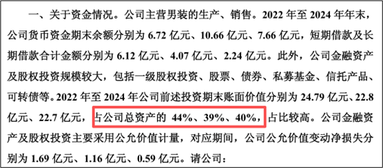 财报来看,截至2025年三季度末,公司投资资产余额约24.34亿元(交易性金融资产 债权投资 其他债权投资 其他非流动资产投资),占公司总资产的43%。其实,重投资是九牧王的常态。根据今年5月上交所《问询函》,2022-2024年间,九牧王投资资产占总资产比例分别为44%、39%、40%。