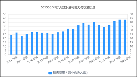 线下和线上失衡的一大弊端,便是运营费用极高。数据来看,九牧王的销售费用占比(=销售费用/营业收入)一直都在25%以上。最近几年,随着“加盟转直营”以及公司业务转型,公司运营费用更是持续增长。2025年前三季度,费用占比已达到44.52%。