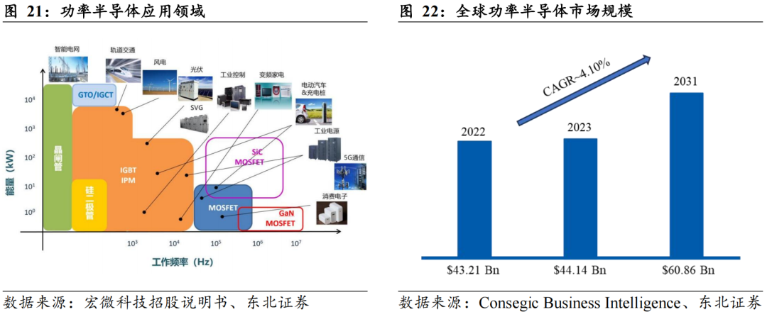 功率半导体是电力电子应用装备的基础和核心器件。主要用于电力电子设备的整流、稳压、开关、变频等,可实现电能的有效转换和传输、提高能源利用效率、增强电力系统的稳定性和灵活性。功率半导体器件作为不可替代的基础性产品,广泛应用于工业控制、新能源发电和电能质量管理、汽车电子和汽车充电桩、家电、消费电子等领域,尤其是在大功率、大电流、高频高速、低噪声等应用领域起着无法替代的关键作用。根据市场调研机构Consegic Business Intelligence发布的研究报告《全球功率半导体市场》,2022年全球功率半导体市场规模达432.1亿美元,2023年市场规模预计增长至441.4亿美元,2031年市场规模预计增长至608.6亿美元,2023-2031年CAGR达4.10%。
