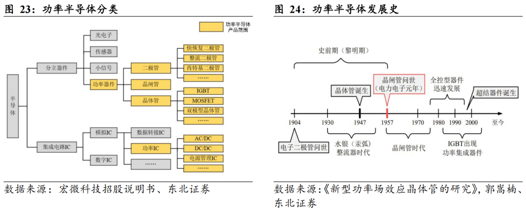 广义功率半导体可以分为功率IC和功率分立器件两大类。分立器件指具有单一功能、独立封装且能够单独工作的半导体元件,功率半导体器件主要包括二极管、晶闸管、晶体管等产品,其中晶体管是市场份额最大的种类,晶体管又可以分为IGBT、MOSFET和双极型晶体管等。功率IC是将多个功率组件(如功率晶体管、电源管理电路、驱动电路、保护电路等)集成在一个芯片上,其内部通常包含多个功能模块,能够执行更复杂的任务,如电源转换、调节、电流控制等。
