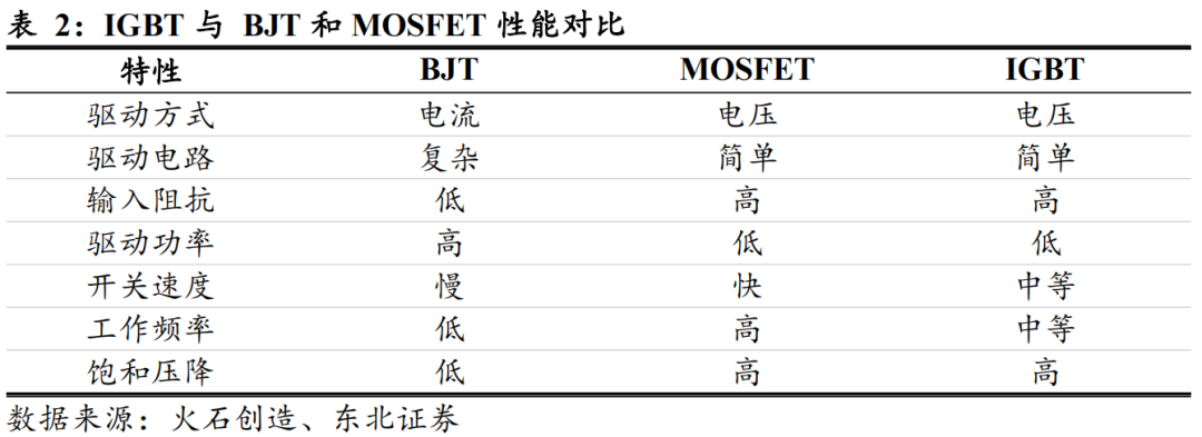 IGBT兼具BJT和MOSFET性能优势,被称为电子行业里的“CPU”。IGBT(Insulated Gate Bipolar Transistor),即绝缘栅双极型晶体管,是一种由BJT(双极型三极管)和MOSFET(绝缘栅型场效应管)组成的复合全控型电压驱动式功率半导体器件。IGBT结合了MOSFET输入阻抗高、开关速度快、驱动电路简单、驱动功率小和BJT导通压降低、饱和压降低、开关损耗小、工作损耗小等特点。IGBT还具备更好的耐压能力和高温特性,整体性能卓越。IGBT主要用于主驱逆变器、车载充电器、光伏逆变器、风电变流器、储能变流器、变频器、电焊机、开关电源、照明电路等。