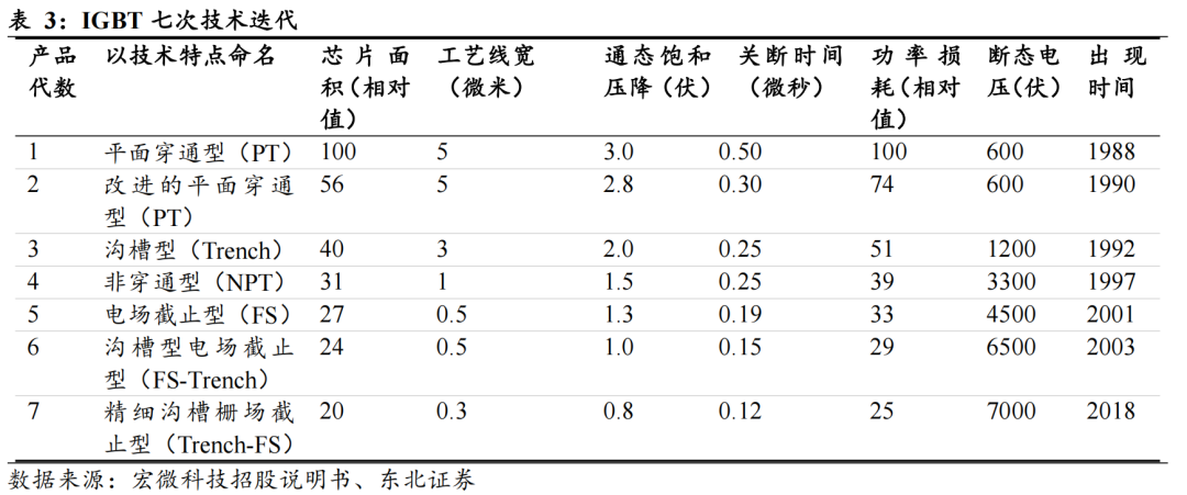 IGBT历经七次技术迭代。从发展历程来看:第一代PT-IGBT使用重掺杂的P 衬底作为起始层,在此之上依次生长N buffer,N- base外延,最后在外延层表面形成元胞结构,工艺复杂,成本高,未大规模使用;第二代NPT-IGBT使用低掺杂的N-衬底作为起始层,在截止时电场没有贯穿N-漂移区,不需要载流子寿命控制,缺点在于更高的电压阻断需求大幅增加器件的损耗与温升;第三代Trench-IGBT得益于场截止以及沟槽型元胞,通态压降更低,开关性能优化;第四代NPT-IGBT较三代优化了背面结构,漂移区厚度更薄,最高允许工作结温从125℃提高到150℃,增加了器件的输出电流能力,是目前使用最广泛的IGBT芯片技术;第五代FS-IGBT使用厚铜代替了铝,允许更高的工作结温及输出电流,同时芯片厚度进一步减小;第六代FS-Trench在第四代的基础上优化了背面P 注入;第七代Trench-FS沟道密度更高,IGBT7 Vce(sat)相比IGBT4降低20%,可实现最高175℃的暂态工作结温。