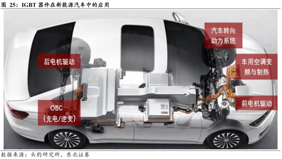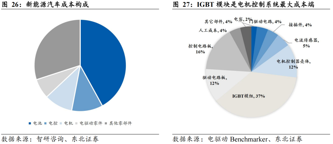 IGBT是新能源汽车电机控制器、车载充电器、充电桩等设备的核心元器件。电控中,IGBT主要功能在于控制逆变器,使高压电池直流电转换为驱动三相电机交流电;车载充电机(OBC)中,IGBT主要功能在于将交流电转换为直流并为高压电池充电;此外IGBT还应用于DC/DC转换器、温度PTC、水泵、油泵、空调压缩机等系统中。新能源汽车中的功率半导体价值量提升十分显著,根据英飞凌年报显示,新能源汽车中功率半导体器件的价值量约为传统燃油车的5倍以上。其中,IGBT约占新能源汽车电控系统成本的37%,是电控系统中最核心的电子器件之一。