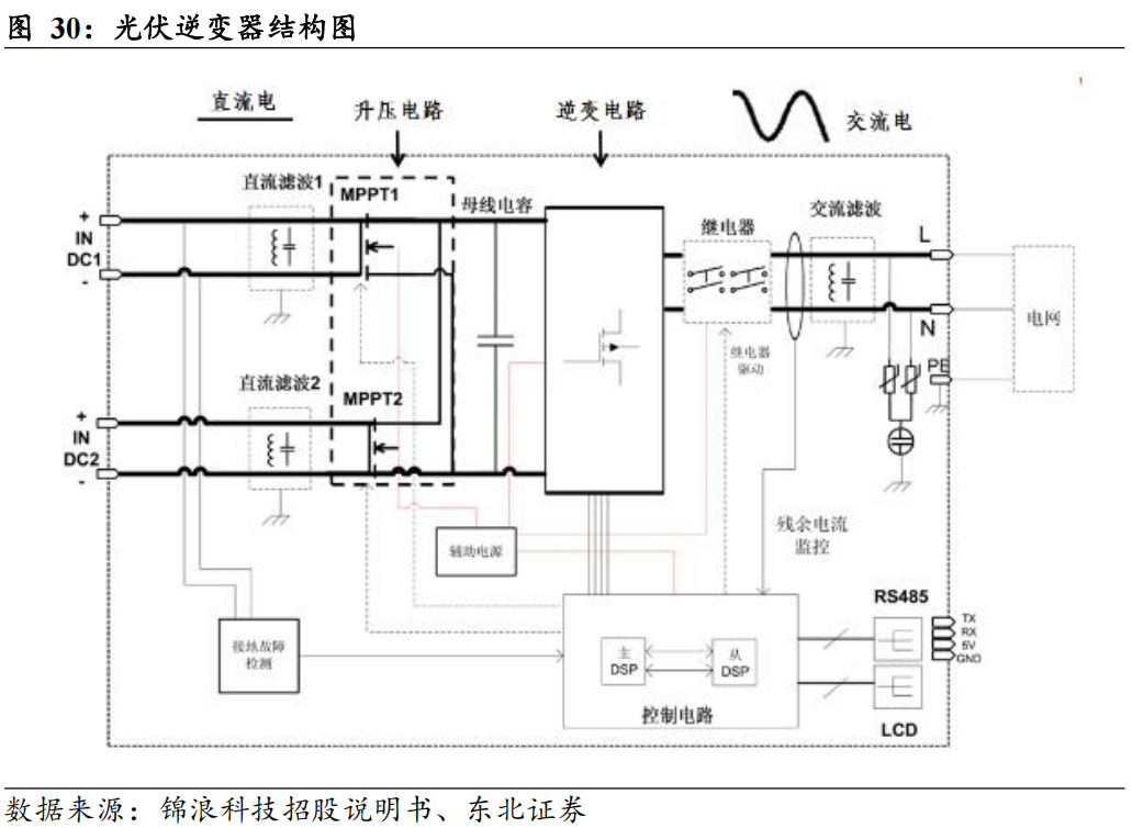 光伏逆变器拓扑结构一般由升压回路(MPPT升压)和逆变回路构成。升压回路把太阳电池的直流电压升压到逆变器输出控制所需的直流电压;逆变桥式回路则把升压后的直流电压等价地转换成常用频率的交流电压。逆变回路分为二电平全桥以及“I”型、“T”型三电平,对应的功率器件有前端防反二极管,Boost电路的IGBT/MOSFET与快恢复二极管。逆变器通常采用IGBT作为功率器件,根据工作电压不同分为650V与1200V IGBT,1500V系统通常采用1200V IGBT“I”型三电平方案。