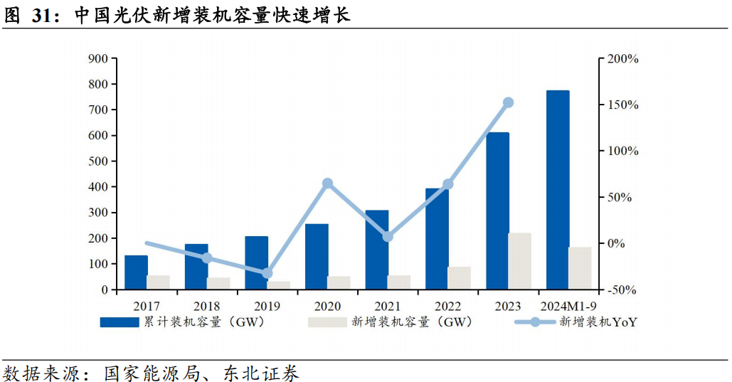 光伏装机快速增长,光伏 储能驱动IGBT增长。根据国家能源局数据,2023年中国光伏新增装机容量216.88GW,同比增长152.03%,新增光伏装机容量连续十一年位居世界第一,配套储能设施数量也将快速增长。在碳中和背景下,光伏和风力等新能源发电技术将成为有效解决方案,IGBT是光伏逆变器和储能变流器的核心器件,光伏和储能装机的快速增长有望带动光储领域IGBT需求持续保持高增长。