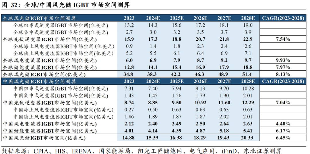 根据我们测算,预测2028年全球/中国风光储IGBT市场规模分别达51.4/20.33亿美元,2023-2028年CAGR分别达8.13%/6.45%。2028年全球光伏逆变器/风电变流器/储能变流器IGBT市场规模分别为22.9/9.7/18.8亿美元,2023-2028年CAGR分别达7.54%/9.93%/7.97%;2028年中国光伏逆变器/风电变流器/储能变流器IGBT市场规模分别为12.29/2.63/5.41亿美元,2023-2028年CAGR分别达7.04%/4.40%/6.17%。