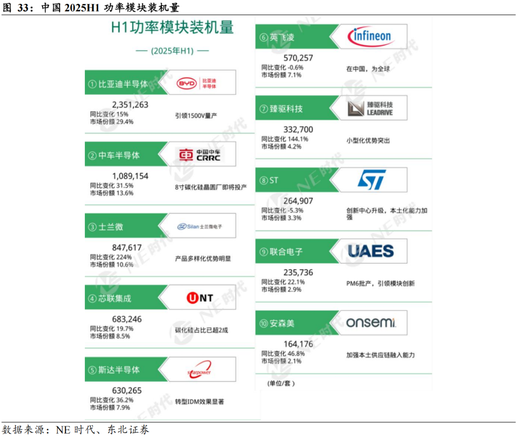 功率半导体是公司价值链的“地基”,形成“器件—模块—系统”闭环。公司在电牵、电网、新能源车电驱、储能/风光逆变与工控等高可靠场景的共性诉求是高耐压、参数一致性与热可靠性。公司借助高压技术优势,在中低压IGBT领域持续收获,IGBT模块交付在轨交、电网领域市场份额大幅领先,占有率国内第一,电网市场中标7条线,首次斩获海外柔直项目大批量订单,公司2024年新能源乘用车功率模块装机量达225.6万套,市占率约13.7%,仅次于比亚迪排名第二。