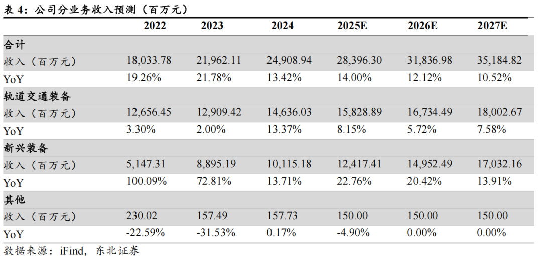 2)预计新兴装备业务2025/2026/2027年实现收入124.17/149.52/170.32亿元,分别同比增长23%/20%/14%。
