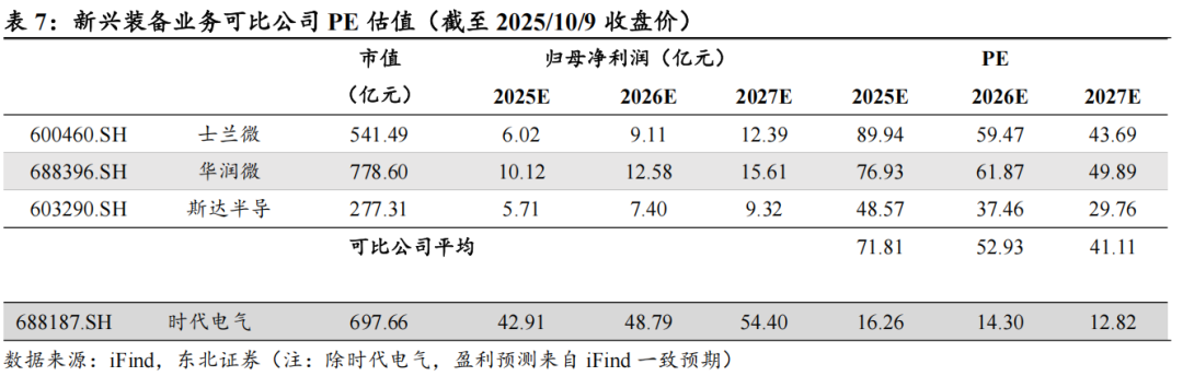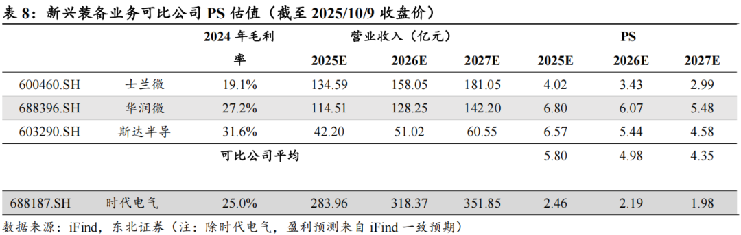 公司新兴装备业务以功率半导体为基,以器件、模块和系统等产品形式交付。士兰微、华润微和斯达半导均为国内IGBT龙头,与公司业务具备一定可比性,选取为可比公司。参考士兰微等企业的PE或PS指标较为合理,2025-2027年平均PE分别为71.81/52.93/41.11,2025-2027年平均PS分别为5.80/4.98/4.35。其中,士兰微、华润微和斯达半导2024年毛利率分别为19.1%、27.2%和31.6%。
