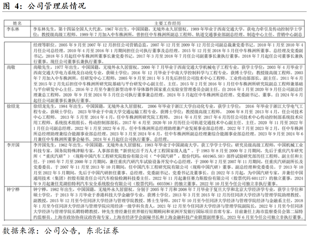 公司拥有一批掌握行业核心技术、高端技能和经营管理的人才。其中研发团队由中国工程院院士领衔,现有研发人员4,066 人,占比40.8%,接近半数拥有研究生及以上学历。优秀的人才队伍为公司形成关键核心技术并保持技术优势奠定了坚实基础。此外,公司管理团队在轨道交通装备制造领域具备丰富的行业经验。原董事长丁荣军先生拥 有超过40年的轨道交通行业经验,2005 年被授予第七届詹天佑铁道科学技术奖与成就奖,2011 年评选为中国工程院院士,2019 年被评为中国地铁 50 周年致敬人物。丁荣军先生主持开发的牵 引变流技术大量应用于轨道交通车辆,带领团队构建了具有完全自主知识产权的半导体产业技术体系。公司现任董事长李东林先生和副董事长尚敬先生亦拥有超过20年的轨道交通行业经验,李 东林先生于 2011 年获得中华全国铁路总工会火车头奖章和湖南省优秀企业家称号,2017 年荣获 全国国企管理创新成果一等奖。尚敬先生是国家中青年科技创新领军人才,入选“万人计划”,享 受国务院特殊津贴,主持和参与国家级科技项目3项,获国家技术发明二等奖1项、中国专利奖 金奖3项。公司现任执行董事、总经理徐绍龙先生是中国中车轨道交通牵引传动控制及新能源系 统技术学科核心代表和资深技术专家,主持和参与国家级科技项目4项,申请发明专利50余项, 获得中国铁道学会铁道科技一等奖、湖南省科学技术进步奖一等奖、茅以升科学技术奖、湖南省 湖湘青年英才、火车头奖章等荣誉奖项。拥有丰富行业经验的管理层团队多年来带领公司准确把 握行业发展机遇与方向,实现跨越式发展。