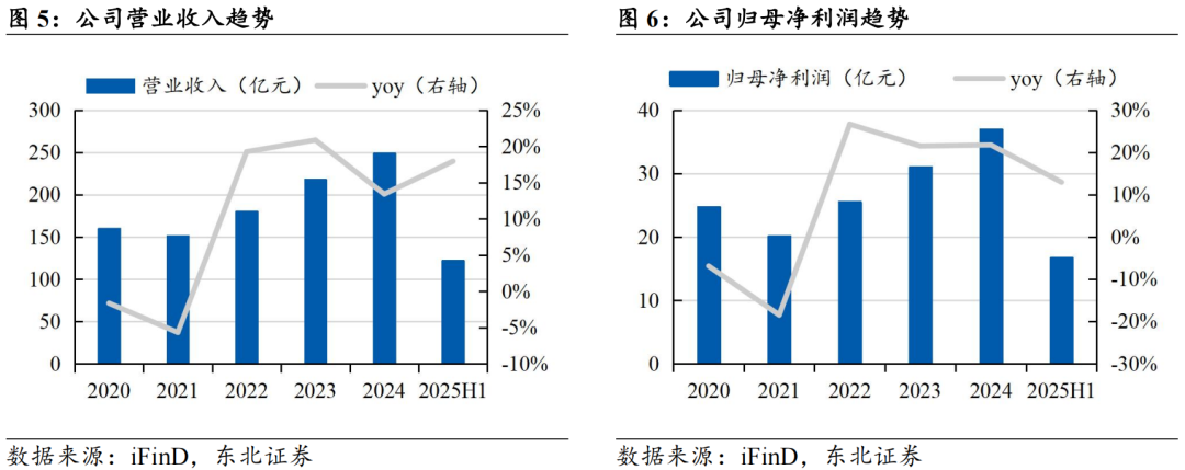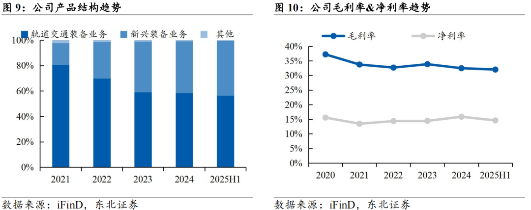 持续改善的收入与利润曲线为公司新产业扩张提供资本与现金承载。 2024年公司实现营业收入249.09亿元( 13.42%)、归母净利润37.03亿元( 21.77%),其中轨交设备与新兴装备两翼齐进,利润改善与规模扩张同步发生,为后续扩产、并购与海外交付能力建设提供了“利润母体”。 2025年上半年,公司实现营业收入122.14亿元( 17.95%)、归母净利润16.72亿元( 12.93%),体现平台一体化在项目放量期的承压与消化能力。