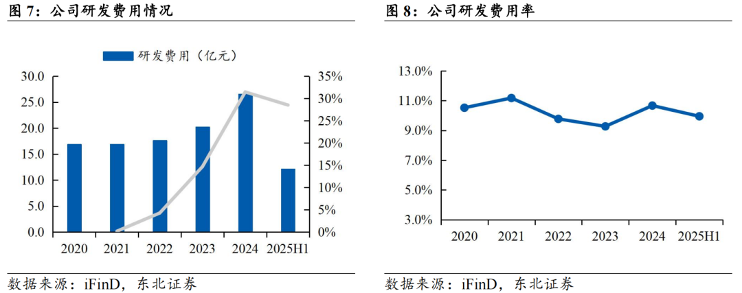 平台化研发通过“共用模型库 可复用工程包”实现规模化效率,而费用结构显示公司把研发资源集中在可迁移的底层能力上。 2025H1公司研发投入12.71亿元(费用化12.15亿元、资本化0.56亿元),费用结构中员工薪酬6.58亿元、折摊1.58亿元、材料3.21亿元,指向算法/器件/工艺三类可迁移资产的持续投入,这类投入在轨交、电网、新能源与海工间共享并通过工程包快速产品化。公司研发费用率总体稳定,维持在10%左右。