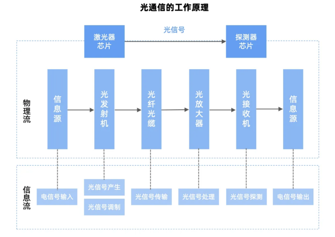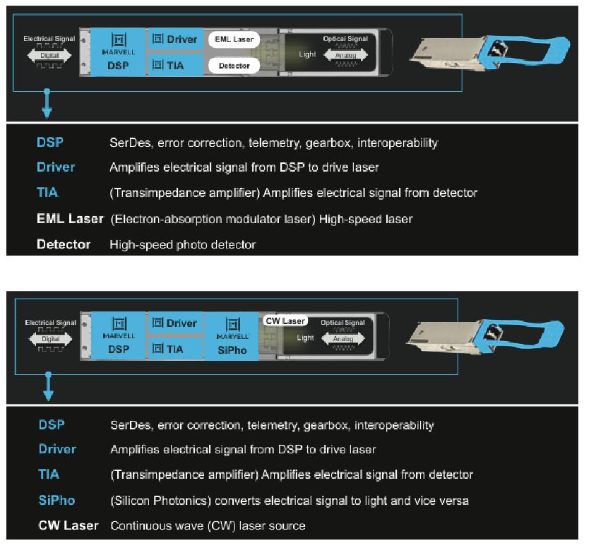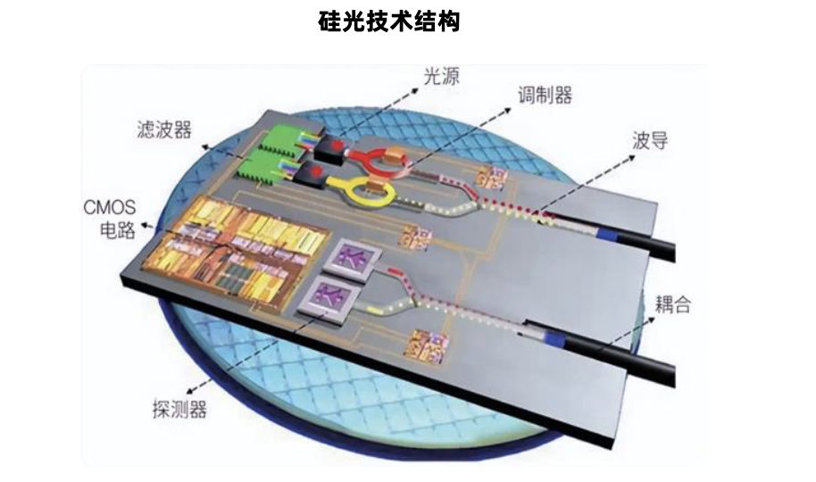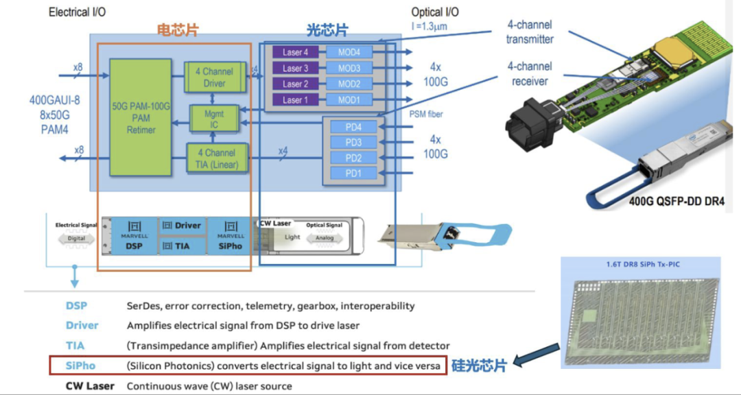 硅光模块以硅光技术为核心,将激光器、调制器、探测器、耦合器、光波导、复用/解复用器件等光子芯片都集成在硅光芯片上,再与DSP/TIA/DRIVER等电芯片一起封装,组成硅光模块。